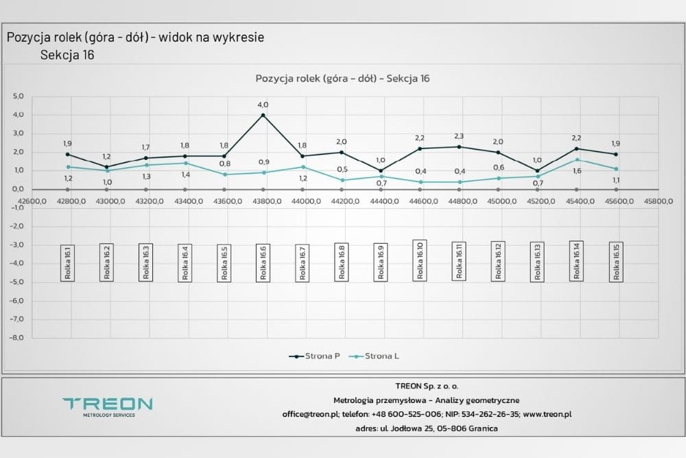 Dzięki zastosowaniu Laser Trackera i starannie przygotowanej metodyki pomiarowej udało się zebrać wszystkie niezbędne dane. Następnie wykonaliśmy ich dokładną analizę i przygotowaliśmy czytelny raport, który wskazał miejsca nieprawidłowości oraz zalecane korekty do ustawienia rolek.