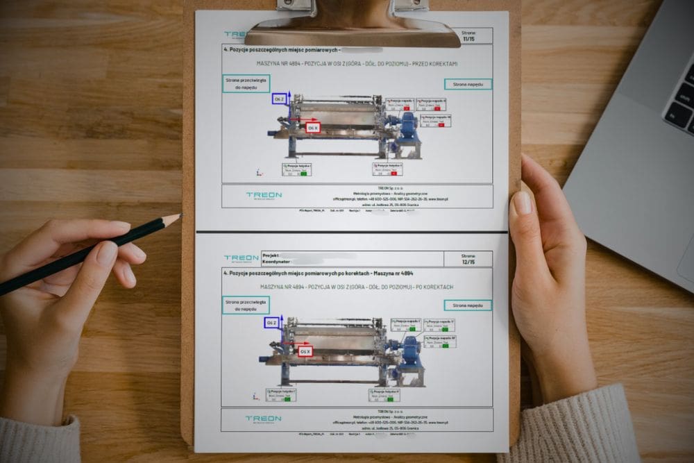 W procesie ustawiania maszyn uzyskano znaczą poprawę wypoziomowania i ustawienia współosiowości. Pozycja do poziomu została poprawiona z 3,5 mm błędu do 0,5mm na całym obszarze roboczym. Poprawne osiowanie elementów w przemyśle jest kluczowe dla zapewnienia płynnego działania maszyny, wysokiej wydajności produkcyjnej oraz jakości końcowego produktu.